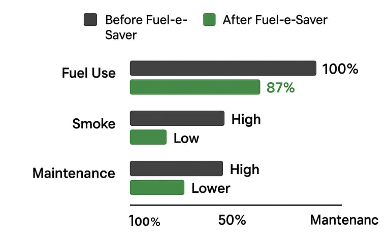 Fuel-e-Saver has been tested extensively on diesel engines used in trucks, buses, agricultural machinery, generators, and construction equipment. Real-world measurements show consistent reductions in fuel consumption, smoke, and soot levels across a wide range of diesel applications.