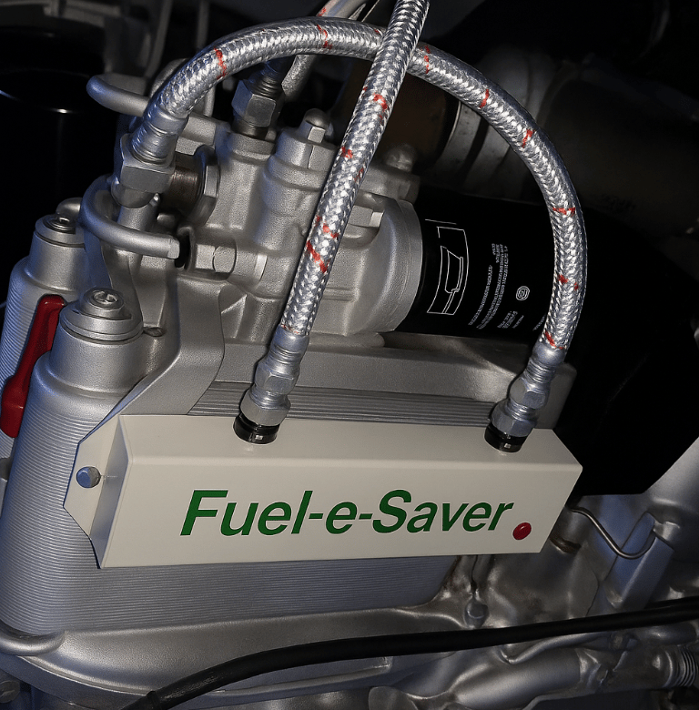 Fuel-e-Saver is an electrostatic fuel-treatment module installed between the diesel filter and the engine. It applies a controlled high-voltage field to the fuel just seconds before combustion, improving molecular alignment and enabling a more complete burn.